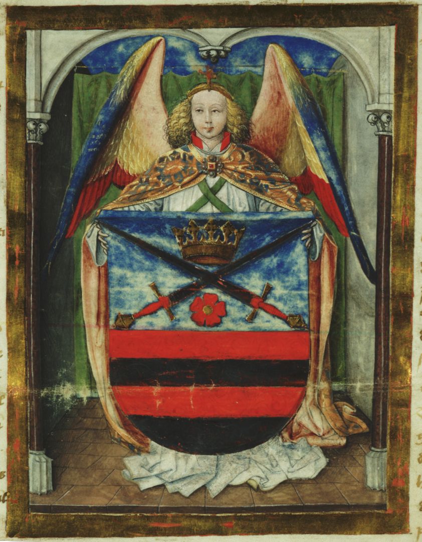 V erbe tranzumptu nachádzame ešte jeden detail, ktorý v origináli veľmi viditeľný nie je. Spod nariaseného bieleho plášťa anjela pod štítom vykúka červený kúsok, čo môže byť časť brokátového plášťa alebo špička topánky. Ak sa lepšie pozrieme na originál, môžeme vidieť podobne vytŕčajúci kúsok bielej, pôvodne pravdepodobne zlatej farby.